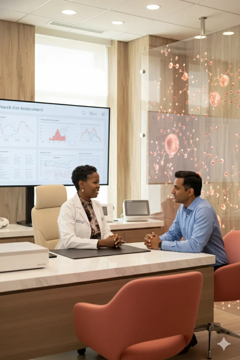 We believe optimal health is essential, not a luxury. Each person has unique genetics, lifestyle demands and goals, so we employ precision medicine instead of one‑size‑fits‑all approaches. Advanced testing and detailed assessments address root causes rather than symptoms. Your journey begins with a comprehensive evaluation and biomarker testing to identify imbalances.